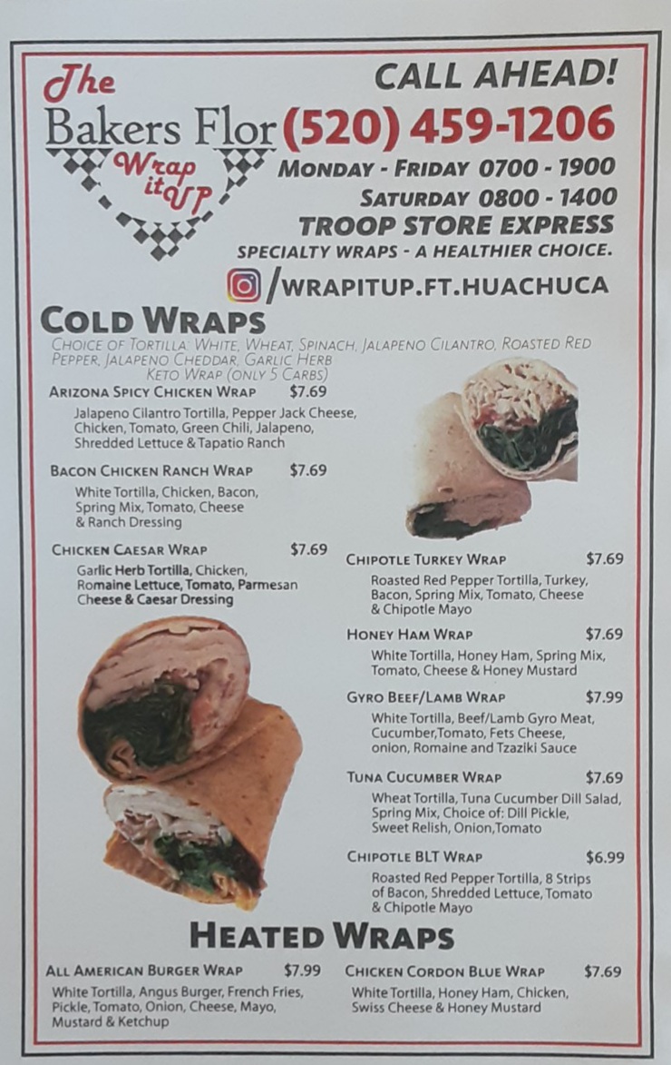 Welcome to Wrap It Up - Bakers Flor Cafe, a delightful oasis located on Allen St in Fort Huachuca, AZ. This gem is praised for its diverse menu that elevates the classic wrap to new heights. Diners rave about the Chicken Caesar wrap, claiming it's even better than popular chain options. The use of fresh ingredients shines through in every bite, ensuring a burst of flavor with each wrap.